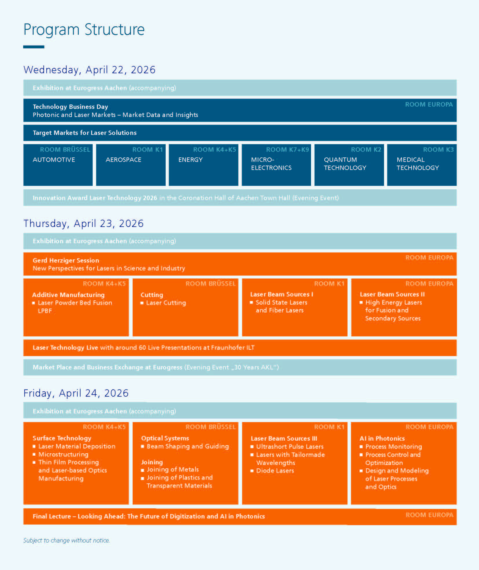 - Dinner with presentation of the “Innovation Award Laser Technology 2026”